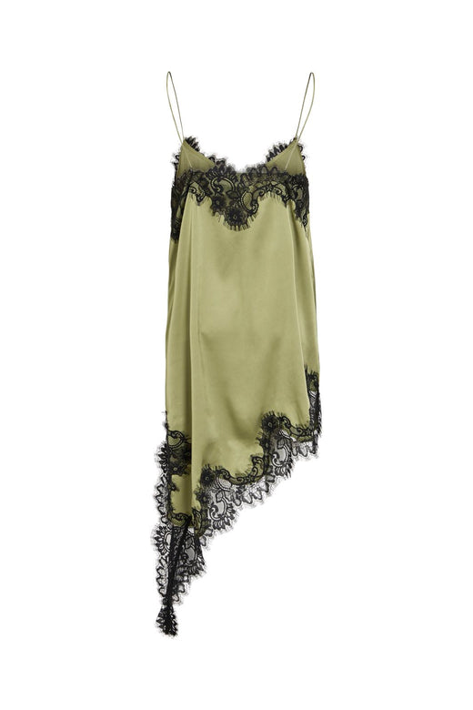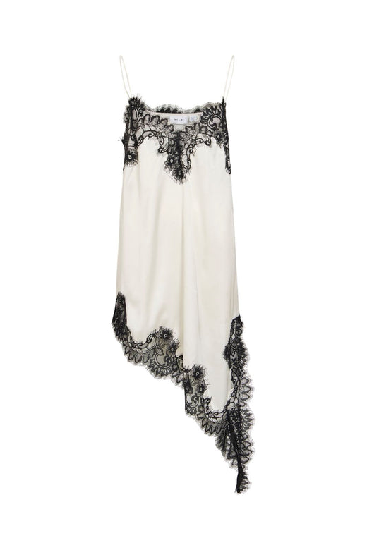 En kort kjole fra Vila i en lys beige nyanse med svart blondepynt. Kjolen har tynne spaghetti-stropper og en V-hals.