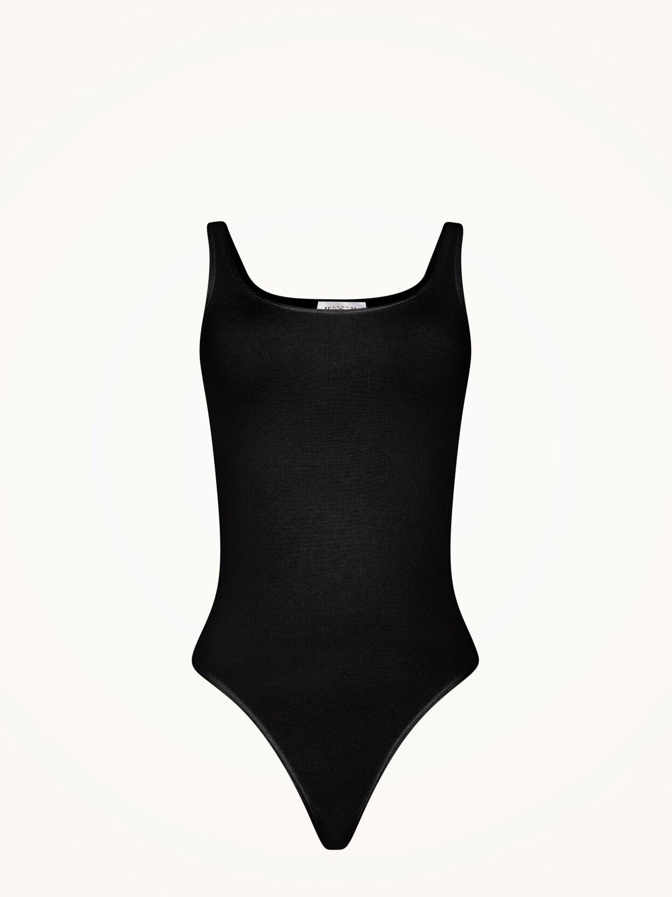 Svartringbody med rund halsutskjæring og høye benåpninger. Den tettsittende passformen og thong-stilen gir en glatt silhuett under klærne.