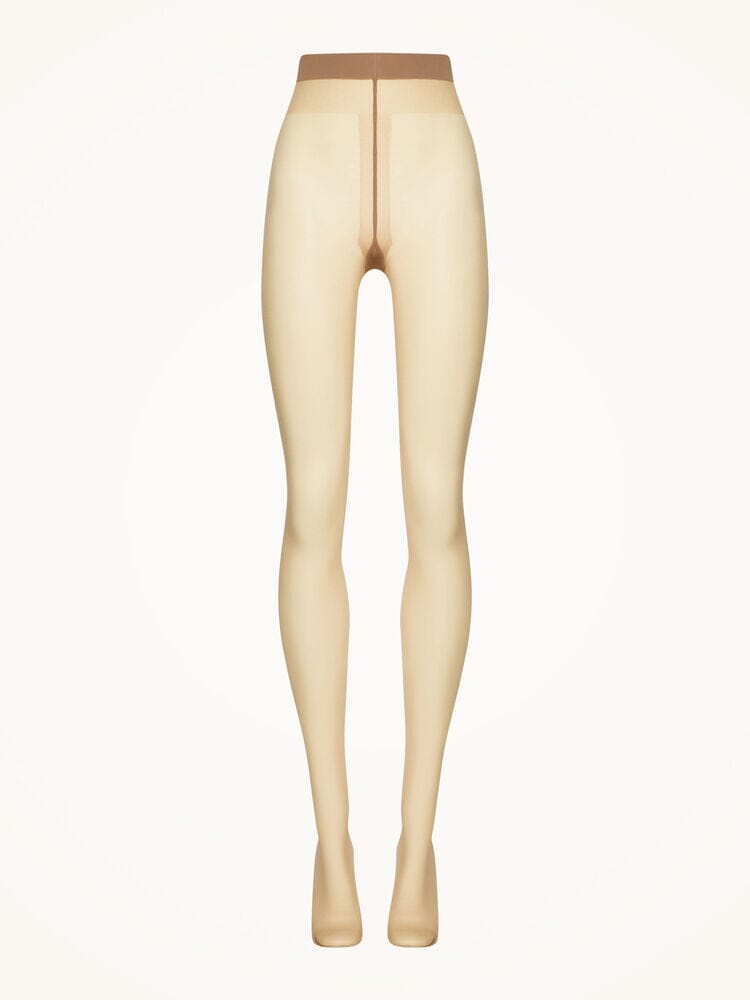 Strømpebukser fra Wolford i karamellfarget nyanse med matt pudderfinish. De tynne strømpebuksene har en denier-verdi på 8, noe som gir en lett og naturlig finish.