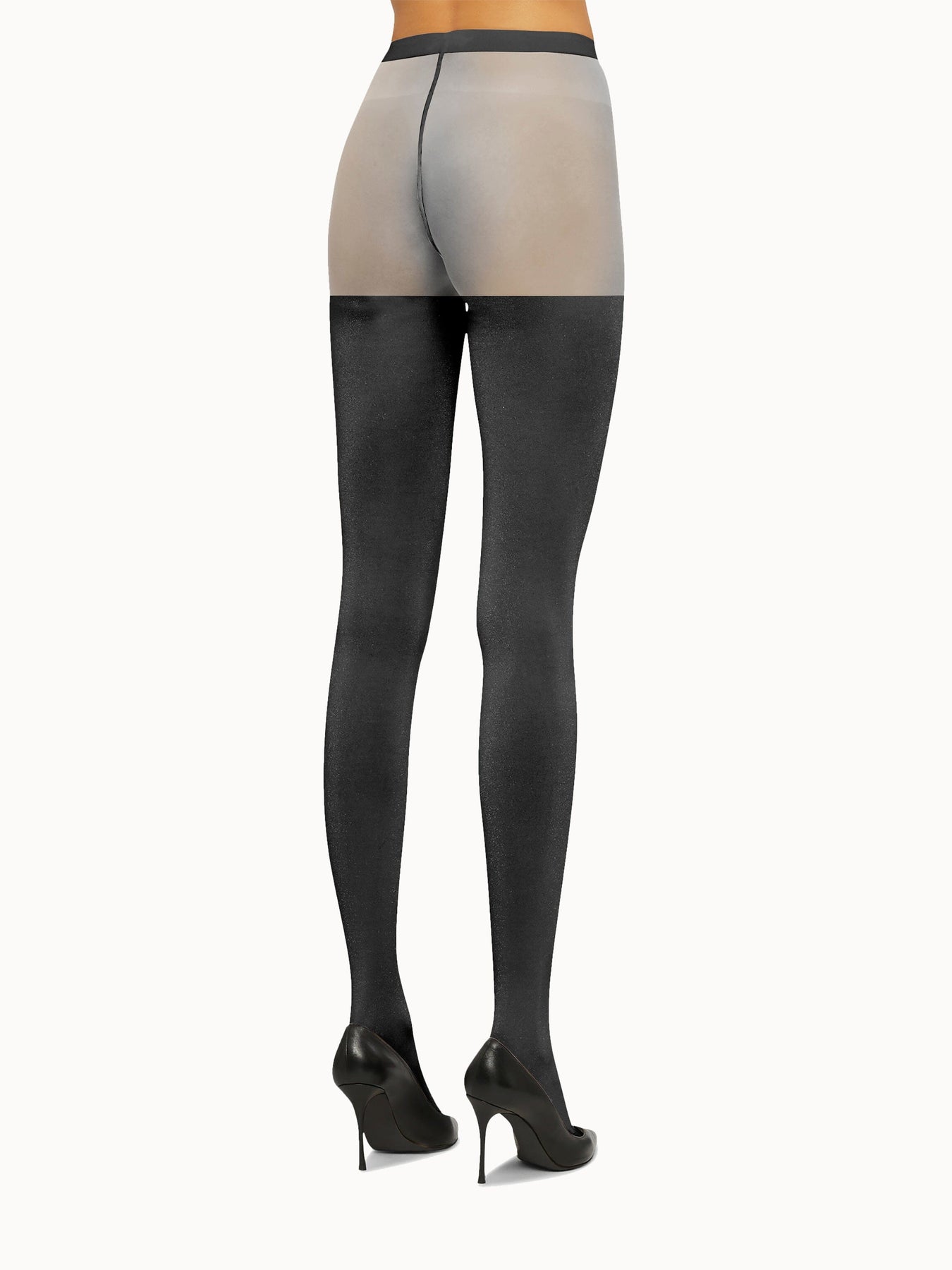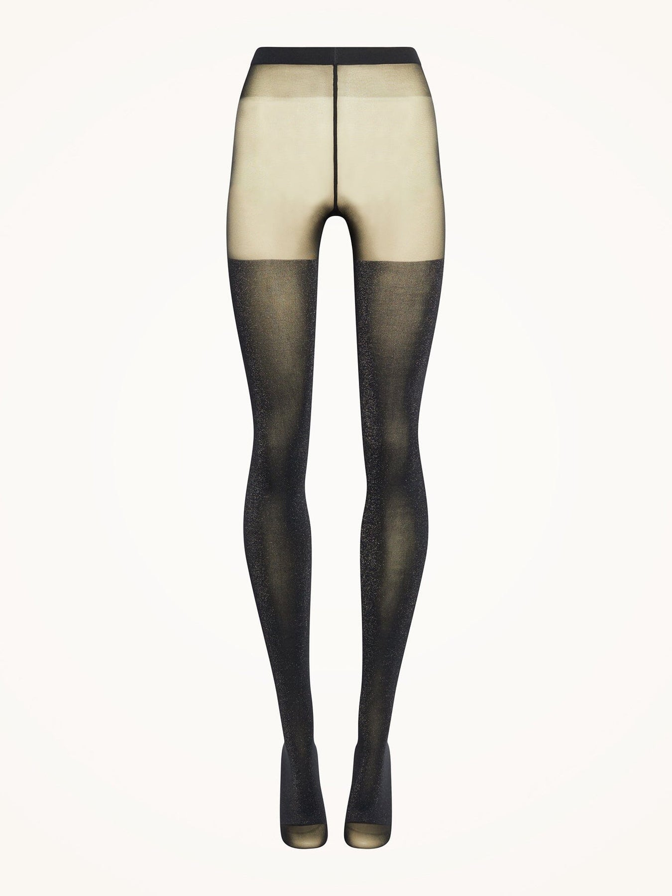 Strømpebukser fra Wolford i svart og grått med glitrende detaljer. Designet har gjennomsiktig tådel, lår og toppdel, mens bena er ugjennomsiktige.