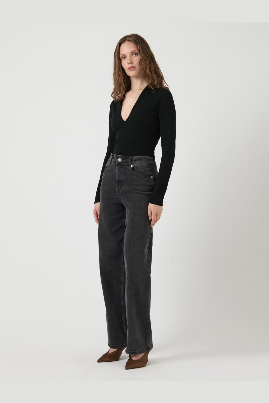 Svart body fra Y. A.S i jerseymateriale med stretch. Den har lange ermer og en dyp V-utringning. Bodyen sitter tett til kroppen og er laget av mykt stoff.
