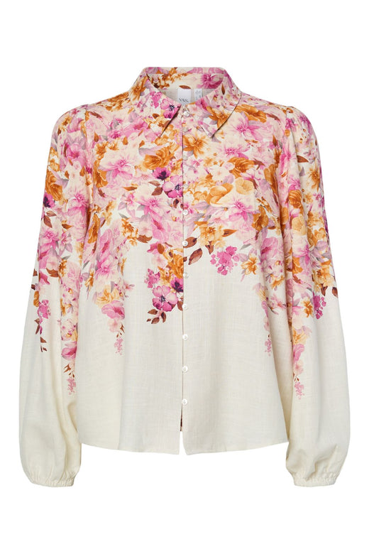 Skjorte fra YAS med lys bunn og blomsterprint i rosa og oransje nyanser. Den har skjortekrage, knapplukking og lange puffærmer.