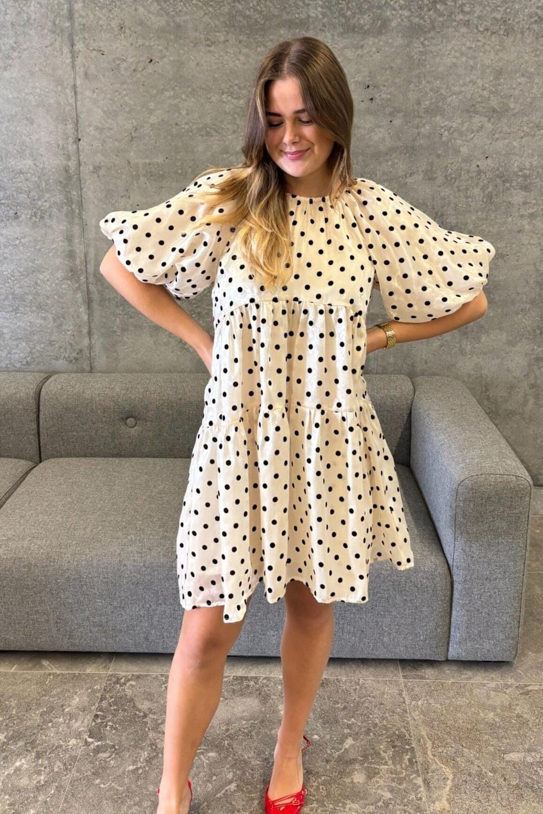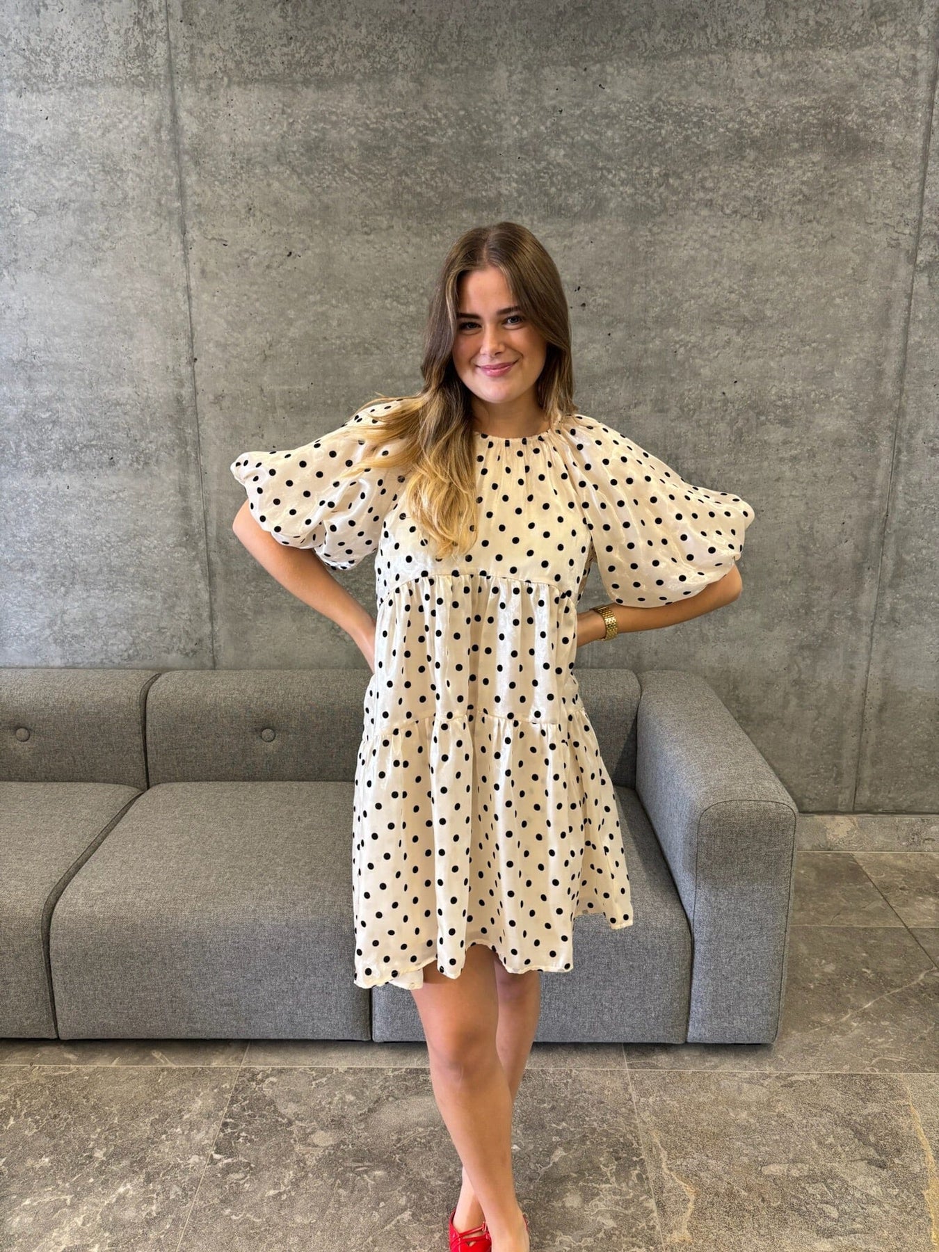 Beige kjole fra Y. A.S med svarte prikker. Den har en løs passform med pufferm og rund hals. Kjolen er knelangs med volanger og bindebånd som skaper et lagdelt design.