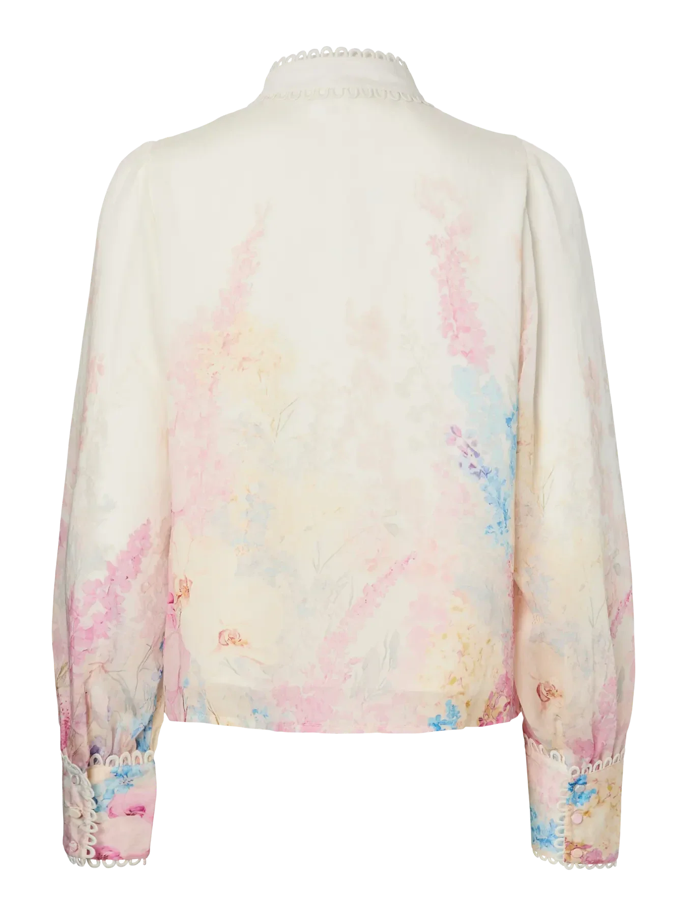 Skjorte fra YAS med blomstrete mønster i rosa, lyseblå og beige. Den har høy hals og lange ermer med blondekanter.