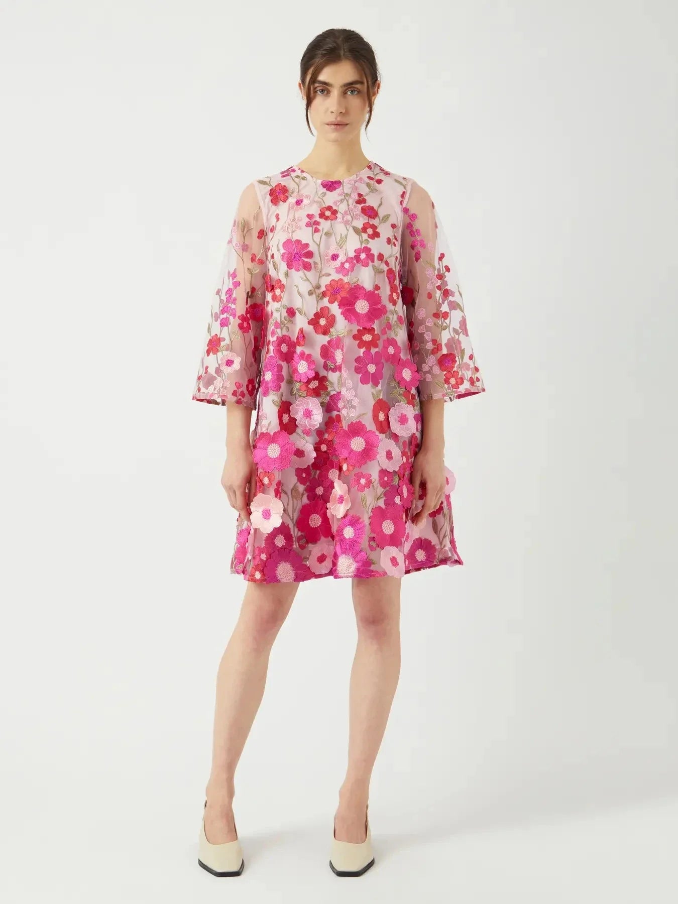 Kjole fra YAS med blomsterbroderi i rosa, lilla og røde nyanser. Kjolen har 3/4-ermer og en A-formet silhuett.