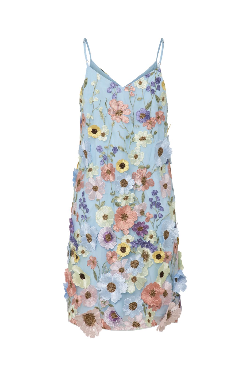 Lys blå kjole fra Y.A.S med broderte blomster i forskjellige farger. Kjolen har tynne stropper, V-utringning og en løs passform som gir god bevegelsesfrihet.