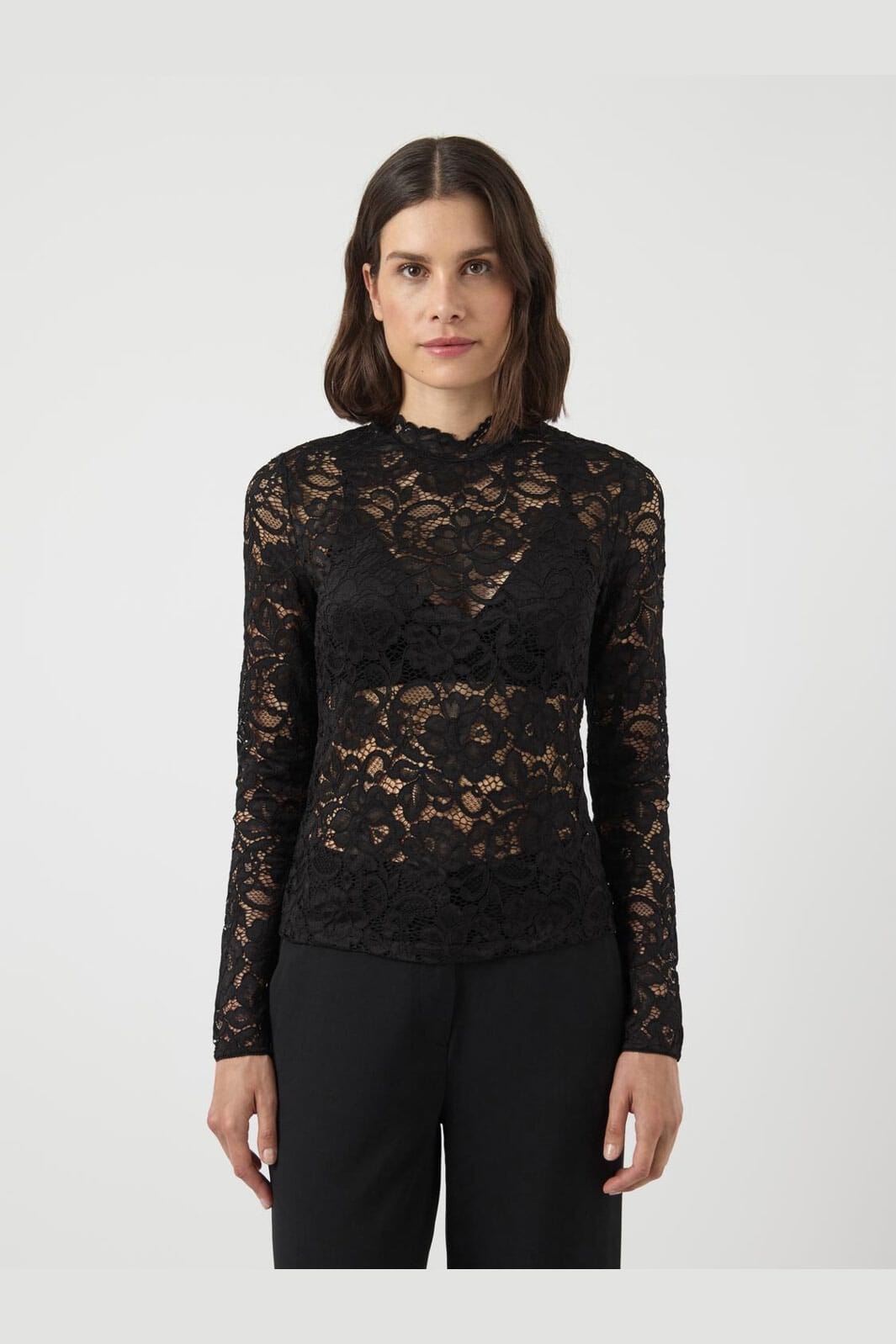 Svart blondebluse fra Y. A.S med blomstermønster. Blusen har en høy hals og lange ermer. Den er laget i et stretchbart materiale med slim fit-passform.