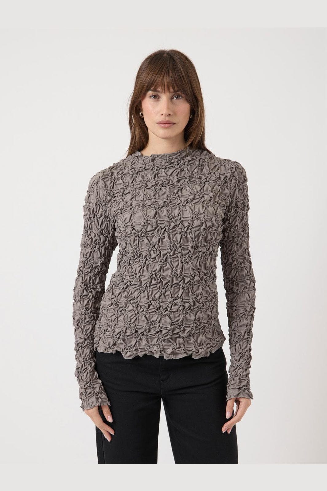 Langermet topp fra Y. A.S i gråbrun polyester. Toppen har en gjennomgående krøllet struktur, rund halsutskjæring og en kroppsnær passform.