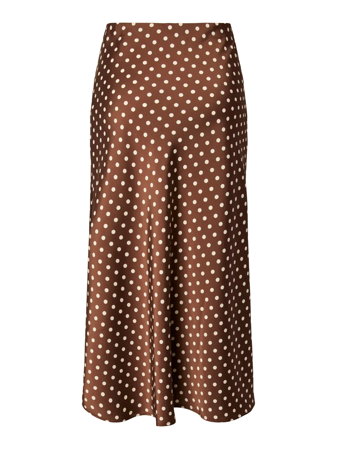 Brun midi-skjørt fra Y. A.S med hvite prikker. Skjørtet er laget av resirkulert polyester med en lett draperende effekt og rekker til midt på leggen.
