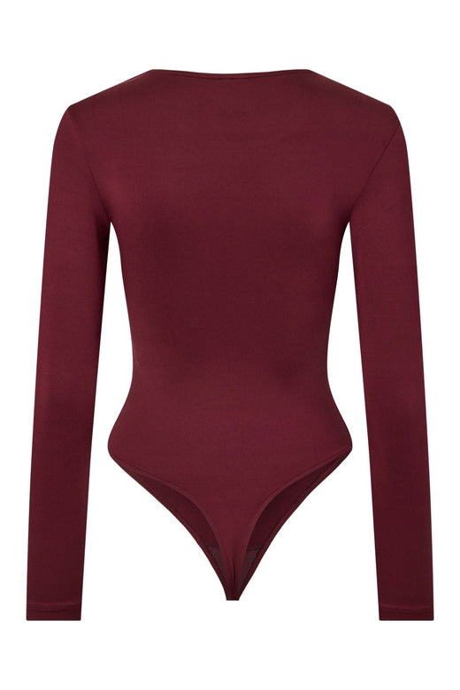 Bordeauxfarget body fra Y.A.S i jerseymateriale med stretch. Den tettsittende modellen har rund halsutskjæring og lange ermer, som gir et dekkende utseende.