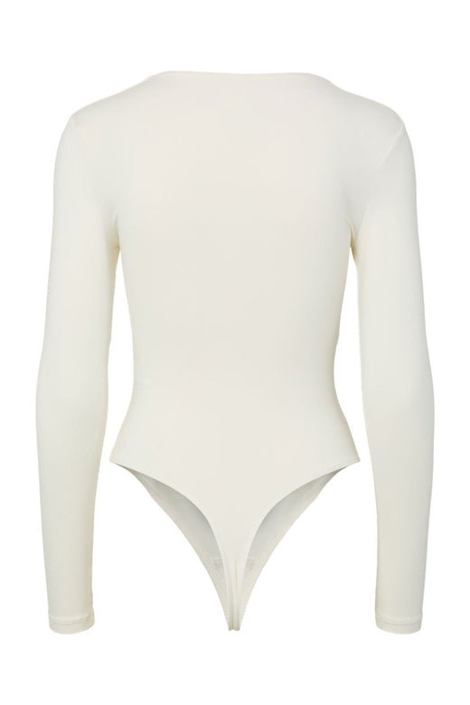 Hvit body fra Y. A.S med lange ermer og høy hals. Den tettsittende modellen er laget av elastisk jerseymateriale, som gir en god passform til både hverdag og fest.