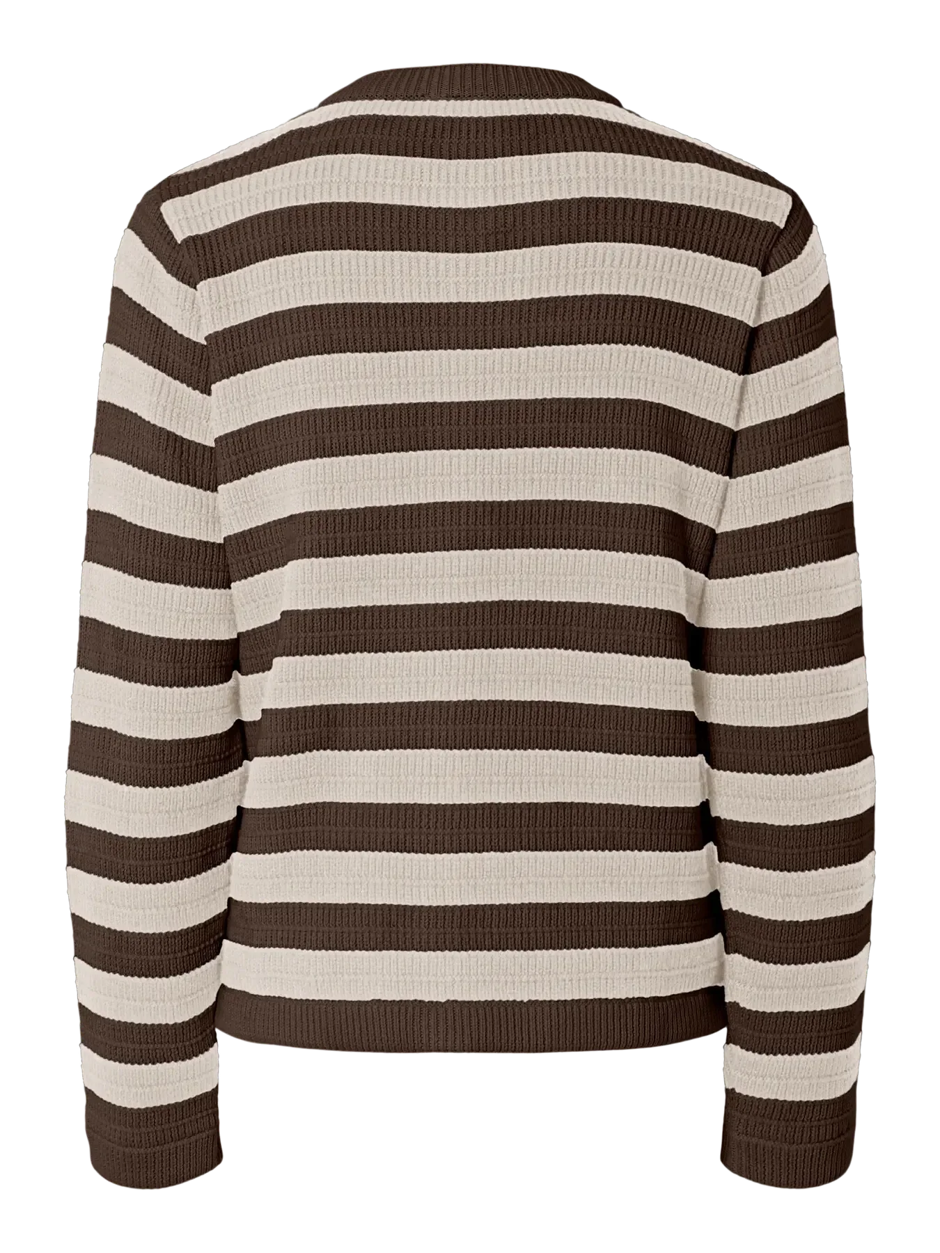 Strikket cardigan fra Y. A.S med horisontale striper i sjokoladebrun og beige. Den har rund halsutskjæring og gyldne knapper foran.