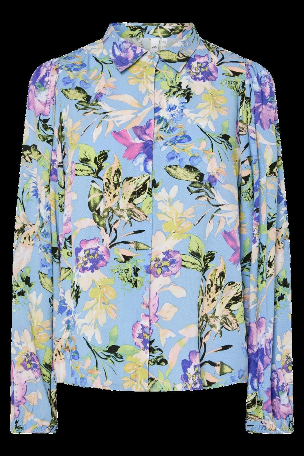 Skjorte fra YAS, laget av 100% Lenzing™ Ecovero™ viskose. Det blomstrete printet i lilla og lyseblå toner dekker hele skjortens overflate.