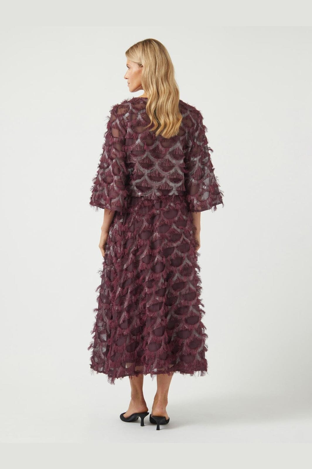 Skjørt fra YAS, laget av 100 % polyester i en dyp burgunder-rød nyanse med metallisk trykk og frynser over hele overflaten.