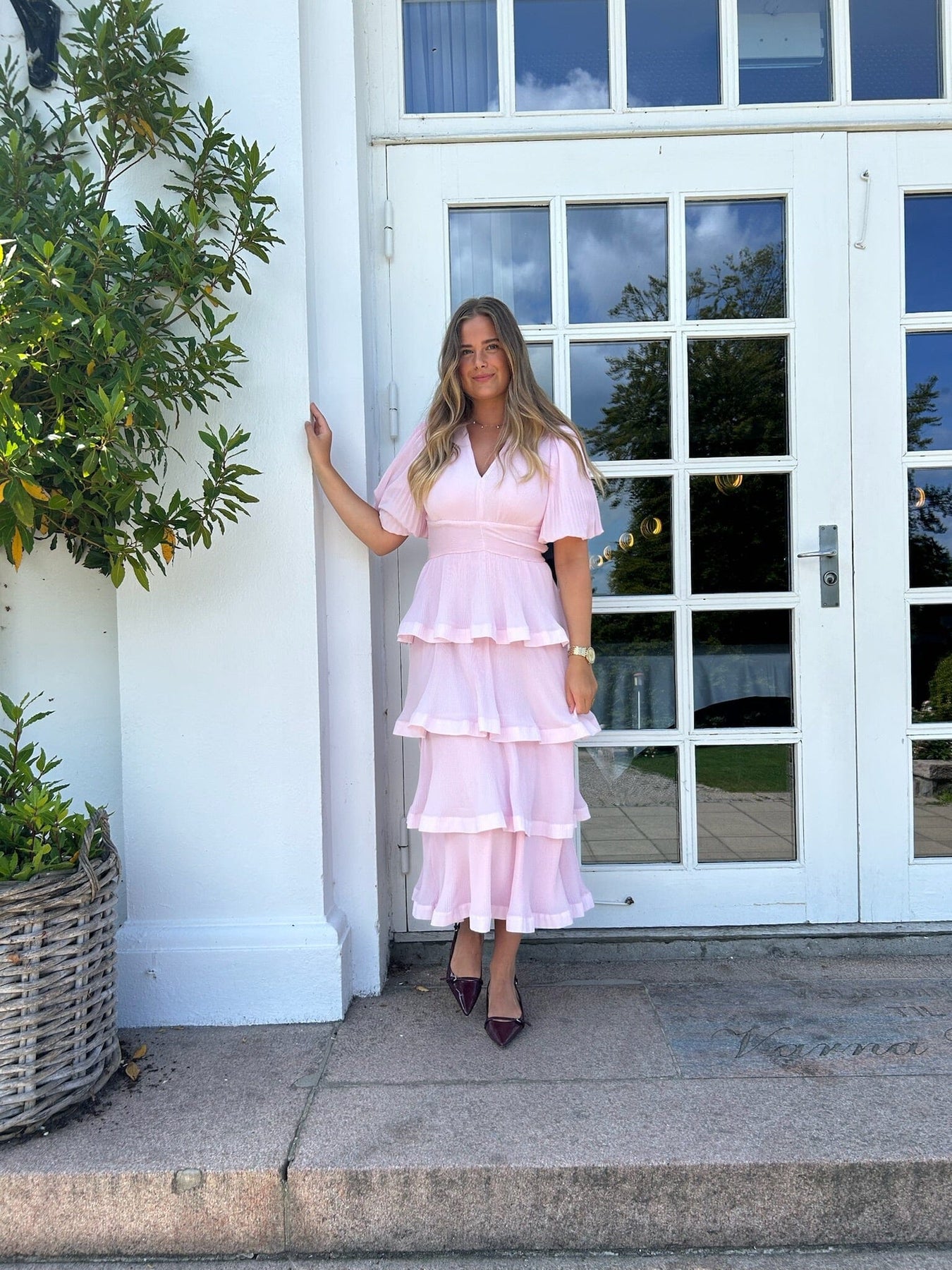 Lang rosa kjole fra YAS i et lagdelt design. Kjolen har V-hals, korte ermer og en løs passform med flere nivåer av volanger.