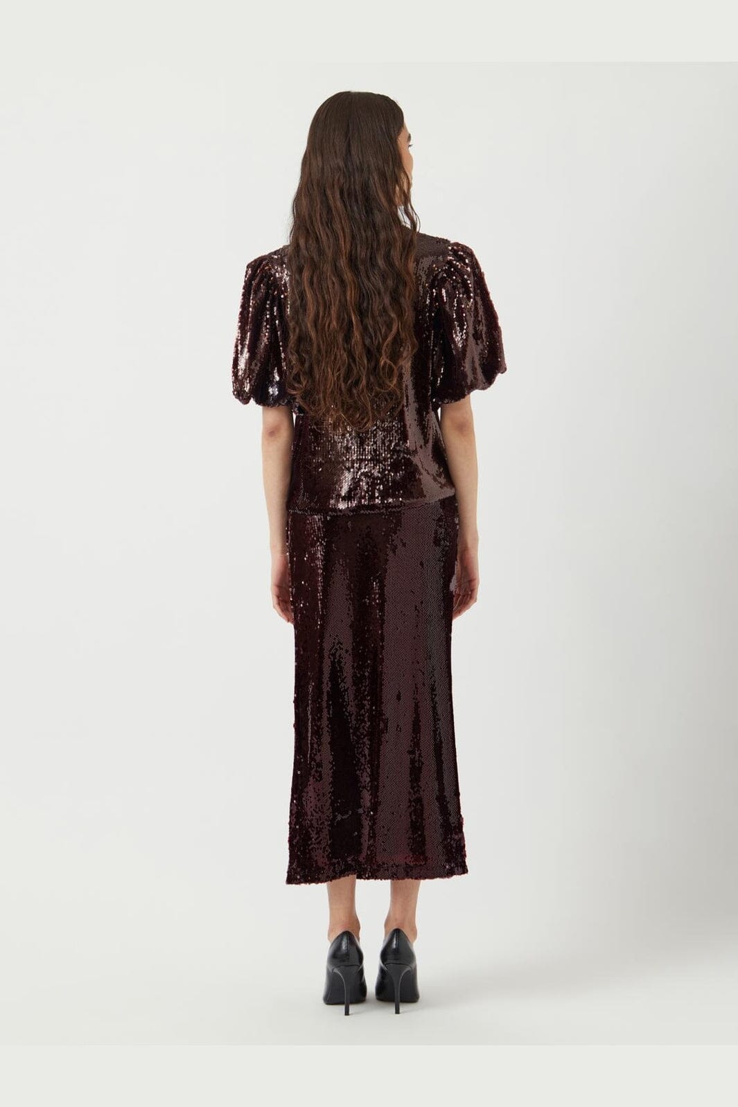 Ankellang skjørt fra YAS, dekket med paljetter i en dyp burgunderfarge. Skjørtet er laget av 100% polyester.