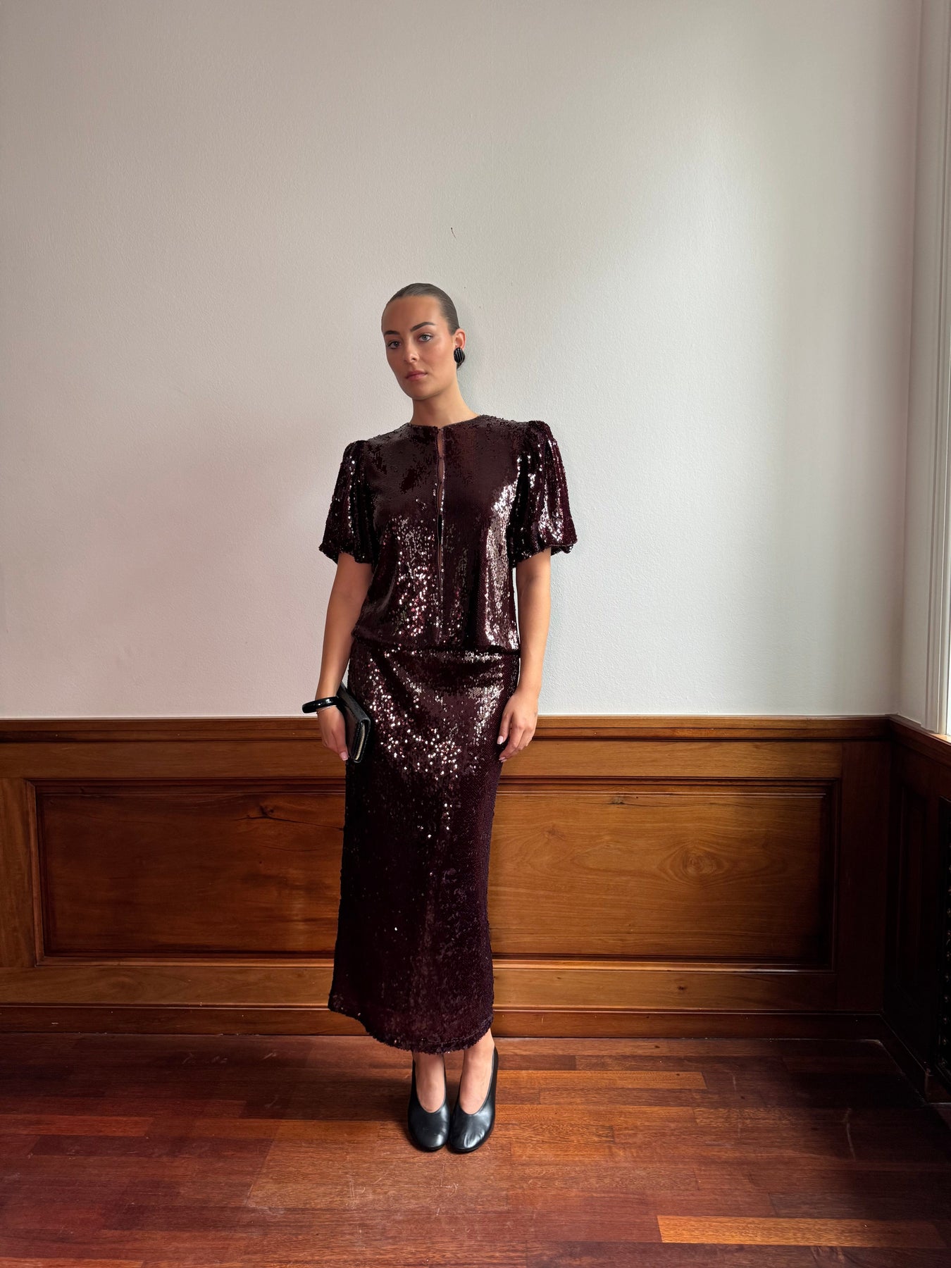 Ankellangt skjørt fra YAS, dekket med paljetter i en dyp burgunderfarge. Skjørtet er laget av 100% polyester.
