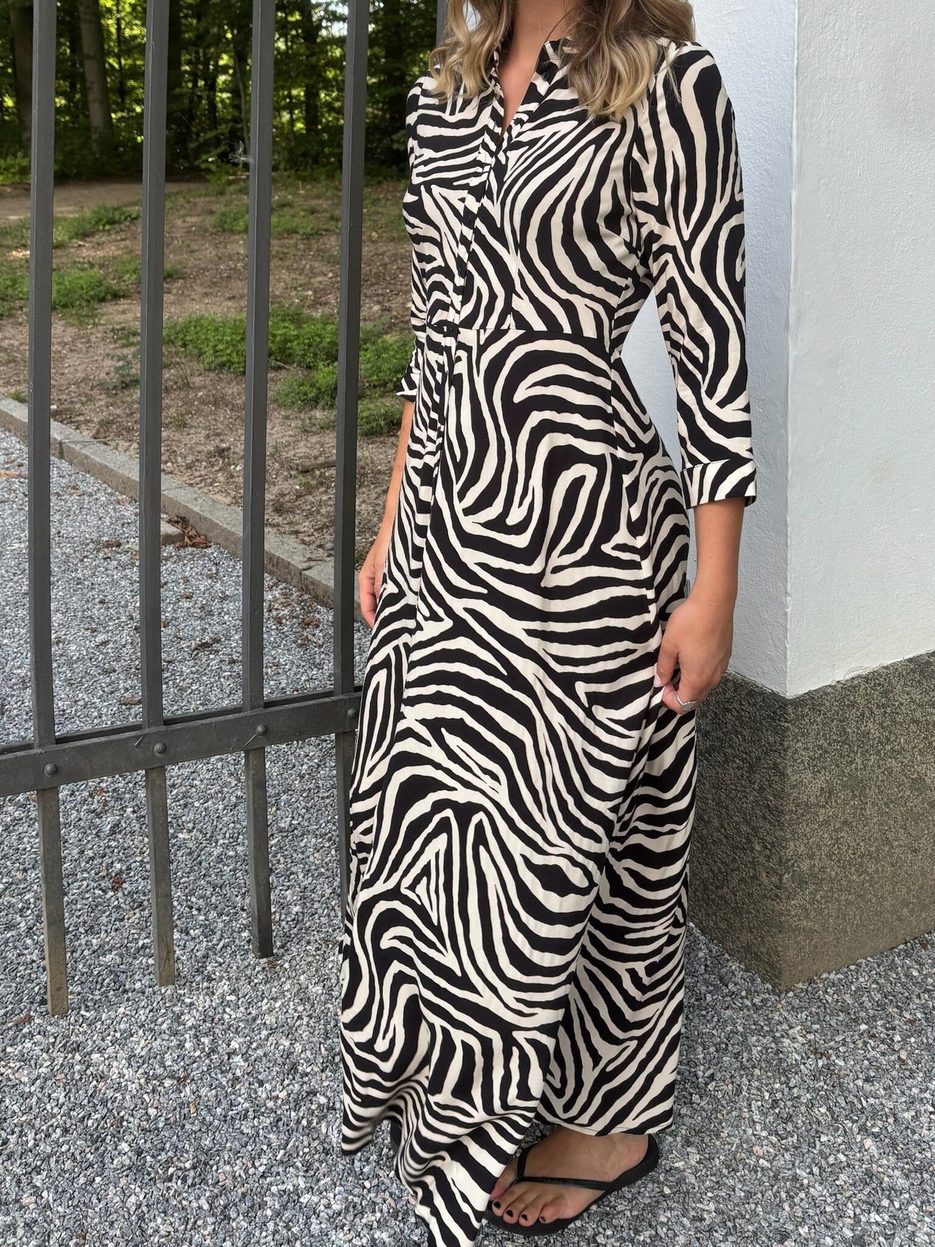 Lang skjortekjole fra YAS, laget av 100 % Lenzing™ Ecovero™ viskose med sebramønster i beige og svart. Kjolen har skjortekrage, knappelukking foran og 3/4-lange ermer.